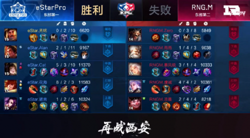 决胜局RNG.M的年轻小伙子们心态有点着急,连续被对方拿下一血、暴君和一塔。但韧性十足的RNG.M并没有放弃,虽然丢掉两条暴君和一条主宰,但凭借偷到的首条暴君连续击杀eStarPro三人并推掉中路一塔。可惜eStarPro凭借经济优势连控两次暴君和主宰,虽然RNG.M单抓程咬金和关羽阻止推进,但经济已被拉开的他们毫无胜算。最后一次暴君团战,RNG.M遭到关羽绕后埋伏被打团灭,遗憾丢掉决胜局的他们无缘总冠军。