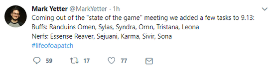 刚刚Riot设计师Mark Yetter在个人推特上公布了9.13版本的改动计划: