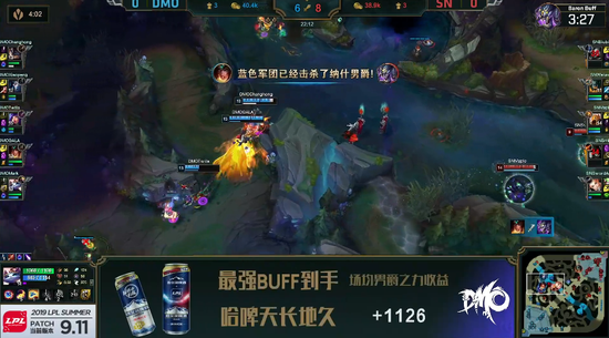 20分钟之后DMO控住了第三条土龙,同时还击杀了奥拉夫,这波DMO直接去拿下了大龙,SN赶来阻止,奈何没有打野,无法抢龙DMO这波击杀了SN的AD与上单。