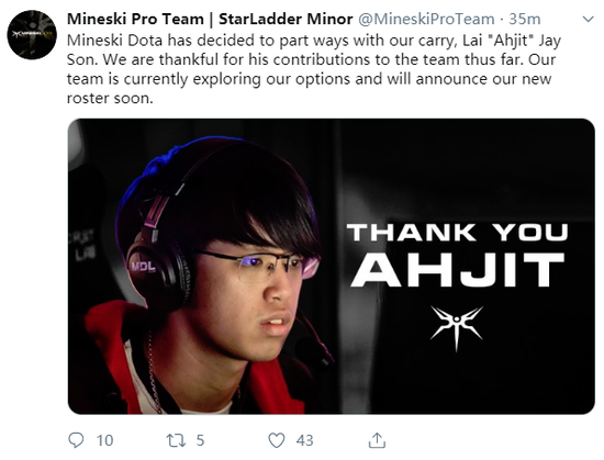 在SL-i基辅Minor S2上早早被淘汰之后,Mineski已经确定无缘TI9直邀,将备战之后的预选赛。不过这个赛季已经进行过多次人员调整的Mineski显然还对自己的阵容不满意,刚才他们就宣布队内的一号位Ahjit离队。
