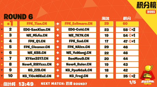 随着第五局的开始,比赛开始进入白热化阶段,彼时EDG_SanXian.CN与EDG_Cold.CN再次拿下第一,开始领跑积分榜。而另外一边FPX_Tian.CN和 FPX_Evilmare.CN则是不落其后成功在第六局成功将积分反超。