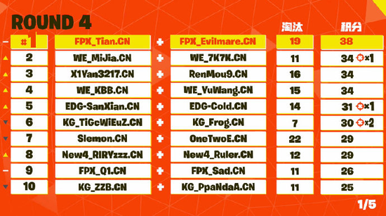 前四局过后,第一天表现出色的FPX_Tian.CN和 FPX_Evilmare.CN继续凭借稳定的发挥以19名淘汰数,38分总积分位列第一。而在中国赛区屡次获得双排冠军的EDG_SanXian.CN与EDG_Cold.CN则在第三局抓住FPX两名队员乱斗之际取得胜利,成为冠军的有力争夺者。
