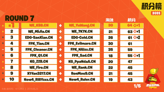 在第七局拿到的18分也帮助WE.KBB(空白)和WE.YuWang(愚妄)最终以64分的总成绩获得《堡垒之夜》中国总决赛双排冠军,晋级纽约线下。此外,与他们同一俱乐部的WE.MiJia和WE.7K7K以一分之差位居第二,获得亚军。