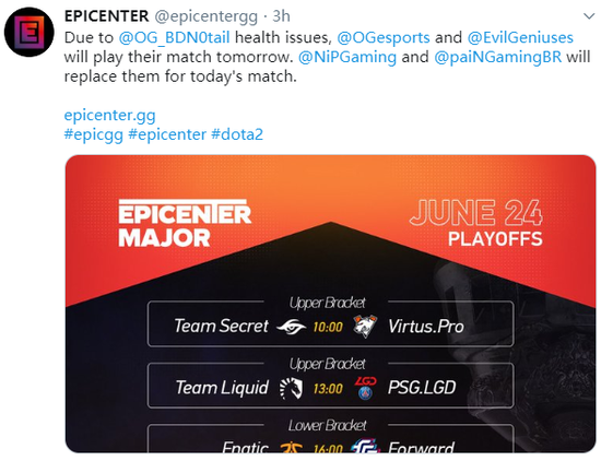 原本今天的比赛中,OG将和EG进行BO1生死战。但主办方宣布,由于大爹仍未恢复,他们允许OG和EG的比赛推迟一天进行。