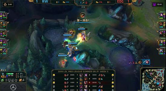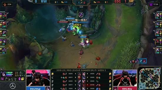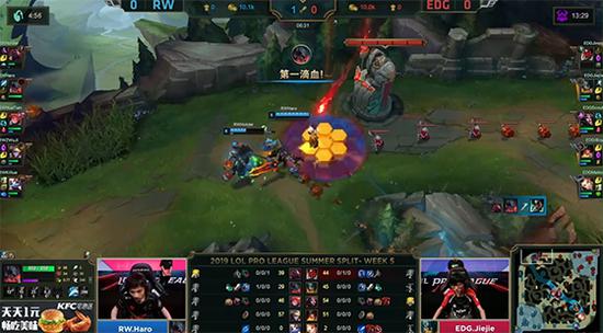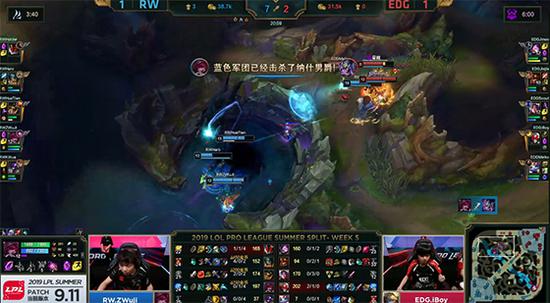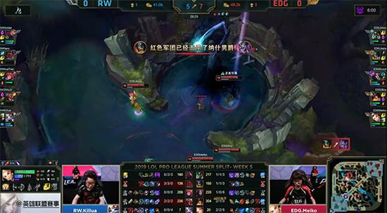 20分钟EDG在下路抓死兰博,不过兰博临死前也换掉EZ,RW果断rush掉大龙。22分钟EDG上野在自家红buff野区抓死兰博,但RW趁势推掉EDG下路高地水晶。24分钟兰博大招劝退EDG,RW又推掉上路高地水晶。27分钟皇子EQ探大龙区视野被打出闪现,RW无压力拿到第二条大龙,EDG三路高地水晶悉数被破,RW让一追二击败EDG获得夏季赛首胜!