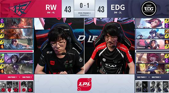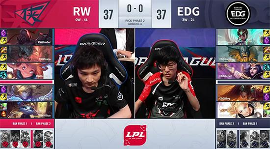 20分钟EDG在中路通过拉克丝的控制和妖姬的伤害先后抓死剑魔和EZ,将经济差拉至3千。23分钟EZ在自家红buff野区被妖姬打成丝血,EDG击杀水龙,随后佐伊又在中路被EDG中辅的poke打出双招,赛恩在下方河道被抓死后,EDG推掉RW中路一塔。27分钟赛恩中路大招开团,但RW后排输出跟不上,赛恩阵亡后EDG开始打大龙,RW试图干扰但EZ被妖姬偷掉,拉克丝Q中剑魔后奥拉夫将其击杀,EDG顺利把大龙收入囊中。30分钟RW在下路绝命一搏最终上辅倒地,EDG长驱直入一波结束比赛,1-0先下一城!