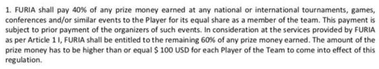 根据Fairchildd说法来看,真正令人担忧的还是在选手与俱乐部关于赛事奖金划分这一块。旧合同中显示,俱乐部将占60%而选手仅有40%的份额。“再也没见过比这还要糟糕的压榨条款了。我可以肯定的说,在Valve的职业圈内很少见到奖金被俱乐部如此划分。”尽管如此,FURIA的老板Andre Akkari仍然表示他所认为这份长达5年的合同有着许多好处。“巨额买断是不存在的事,他和旧合同一样,仅仅是按照比例提升了工资和福利等。”他写道“如果有选手坐上替补席,我们也会最大程度的减少转会费用。”