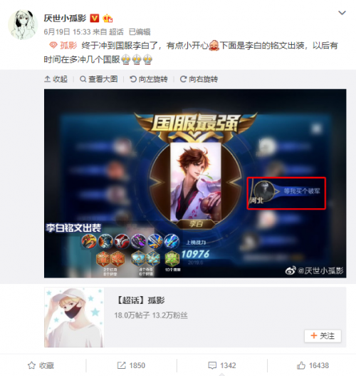 6月19日,孤影在微博发布一条消息“终于冲上国服李白了,有点小开心,下面是李白的铭文出装,以后有时间再多冲几个国服。”