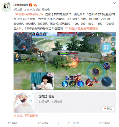 除了用这些精彩的操作合辑回馈粉丝,孤影更是用现金礼物和神秘周边礼包大方送粉丝,评论区的199楼,1999楼,2999楼,3999楼,4999楼,5999楼,6999楼都能得到孤影送出的礼物。孤影是6月23日12:06发布该微博的,不到半小时的时间,评论已经超过了9000+。