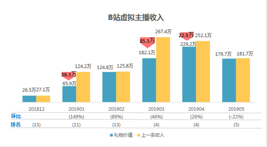 7 虚拟主播吸金能力强:虚拟主播带来的收入在第三个月已经突破百万,在经过3个月的高度增长,已经跻身B站收入板块的前五