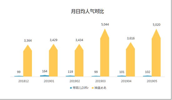 2 虽然帝菲儿Diffir日均开播时长高于神楽めあ,但是日均人气却远远低于神楽めあ,人气只有神楽めあ2%左右(相差50倍左右),这跟B站本身是一个二次元文化集中地有着很大的关系,喜爱二次元的用户远远高于虎牙,但帝菲儿Diffir人气在近三月呈直线式上升趋势。