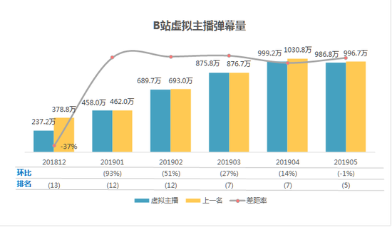 10 虚拟主播大弹幕量阶梯式高速增长,跻身B站前十板块,现在的弹幕两已经是初月的5倍,并且稳定于1000万左右,与前一名板块的弹幕量几乎无差距。
