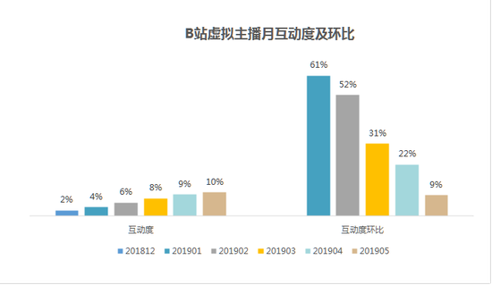 5 虽然虚拟主播互动度位居整体前列,且互动度逐月上升,但是每月增速下滑坡度大,互动度有趋于稳定的趋势