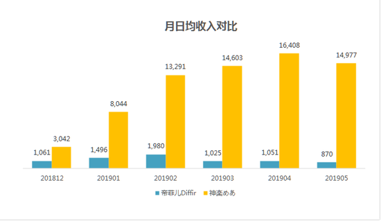 3 跟人气同样的趋势,帝菲儿Diffir日均收入也远远低于神楽めあ,差距在17倍左右,差距比人气差距还大,并且帝菲儿Diffir日均收入出现下滑趋势。