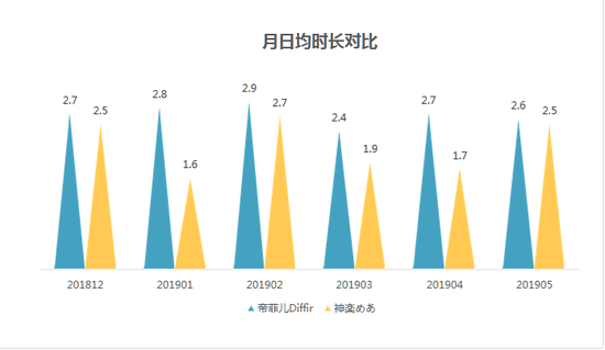 1 帝菲儿Diffir日均开播时长高于神楽めあ:帝菲儿Diffir开播时长每月日均都在2.5小时以上,神楽めあ每月日均处在2小时左右。