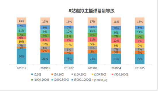 12 50%虚拟主播的弹幕量低于500条,且每个月各等级弹幕量主播份额变化不大,趋于稳定