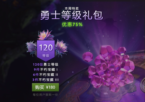 想要购买《DOTA2》Ti9特惠小紫本的玩家,可以在《DOTA2》客户端中点击首页的“本周特卖-勇士等级礼包”进行购买,仅需180元就能得到120的小字本等级、9件“不朽一”、6件“不朽二”和9件“不朽三”,各位刀友们赶紧下单购买吧。