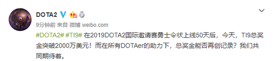 在2019DOTA2国际邀请赛勇士令状上线50天后,今天,TI9总奖金突破2000万美元!而在所有DOTAer的助力下,总奖金能否再创记录?我们共同期待着。