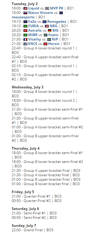 本次ESL One科隆站的小组赛将于7月2-4日进行,小组赛赛制为双败淘汰赛制,首轮比赛为BO1,之后场次均为BO3,小组赛优胜者将直接晋级半决赛,而2-3名则会进入到四分之一决赛中。淘汰赛将于7月5-7日在德国朗盛体育场进行,决赛将会在周日晚10点上演BO5大战。