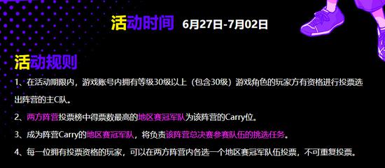 符合条件的玩家可以在活动页面进行投票选出心仪的阵营CARRY位,活动结束后投票最高的两支战队将分别代表复仇队以及正义队,目前排行榜中复仇队南京冠军领先,正义队中武汉冠军领先,会不会出现反转呢?