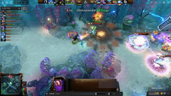 34分钟敌法在上路一个人打精灵飞机两个先杀精灵还要杀飞机,精灵买活VG全员过来终于留下了敌法。