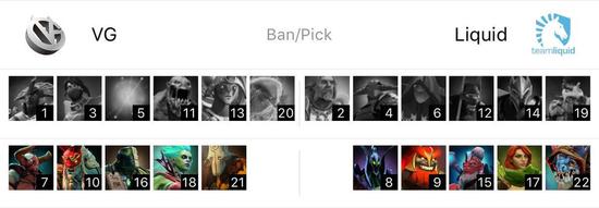 VG在天辉方,Liquid在夜魇方。双方前两手的选人都非常快,应该是提前想好的体系,VG最终是剑圣DP的双核加上人马土猫双冲脸,5号位墨客提供爆发和输出;风行人柱力选出了风行者,最后一选拿出大哥小鱼,马尔斯拉比克萨尔三兄弟打团也很强势。