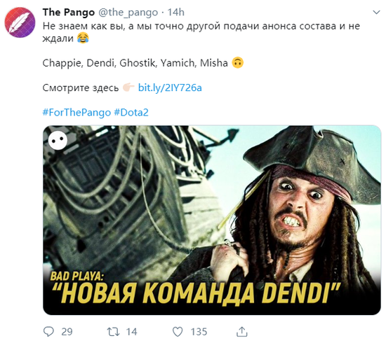 在昨晚震中杯Major决赛激战正酣时,独联体赛区的滚滚队Pango公布了自己的最新成员名单,原本队内的五位选手除了Ghostik全部离队,四名新选手加入,其中包括了Dendi。