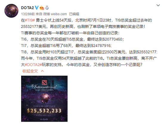 在#TI9# 勇士令状上线54天后,北京时间7月1日23时,TI9总奖金超过去年的25532177美元,再创历史新高,也刷新了单项电子竞技赛事的奖金记录!