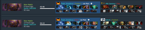 Jines在今天的第一局比赛,他们花了34分钟的时间,击败了另一只海选战队Adroit。过程中,Forev的伐木机在优势路打得对面不敢占线,Febby的白牛也对敌人的中路发动了好几次成功的袭击。硬实力差距太大,Jines赢得轻松惬意。第二轮面对越南战队496,Jines在中期遇到了一些麻烦。三个韩国人的英雄还是伐木机、白牛和冰魂,或许是看了对手上一把的录像,越南人在前期抵挡住了来自Jines的进攻。不过到了25分钟的中路遭遇战,Gunnar的水人在第一时间就击杀了对面的火猫。随后,Jines乘胜追击,打出了一波零换四的高潮。后期团战,装备A杖的水人先后变身萨满和骷髅王,打出了关键控制。496防守失败,Jines再胜一局。