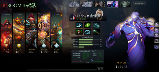 终于到了第三轮,Jines总算碰到了一个小有来头的对手——印尼国家队 BOOM ID。在说这个BO1前,先讲一个有关BOOM教练的小插曲。今年五月一日,因为“薪水门”被PPD从NIP扫地出门后,教练Clairvoyance没了工作。直到六月七日,BOOM ID向他抛出了橄榄枝。但是从今天的比赛来看,Clairvoyance并没有在BP上给BOOM带来太多的帮助。剑圣、火猫、人马、术士、萨满,这个阵容打天梯还凑合,打比赛真的比较吃力。再看韩国人那边,Forev又是伐木机,March还是冰魂——但Febby这次不玩白牛了,玩了一个比较有技术含量的谜团。比赛中,这个谜团打野杀人两不误,在14分钟的野区团战中也用大招抓住了对面的剑圣。那波四换一的高潮结束后,Jines便掌控了局势。20分钟,BOOM强行动手伐木机,却引来了杀身之祸。残局,23savage的骷髅王拿下三杀,Jines锁定胜局。