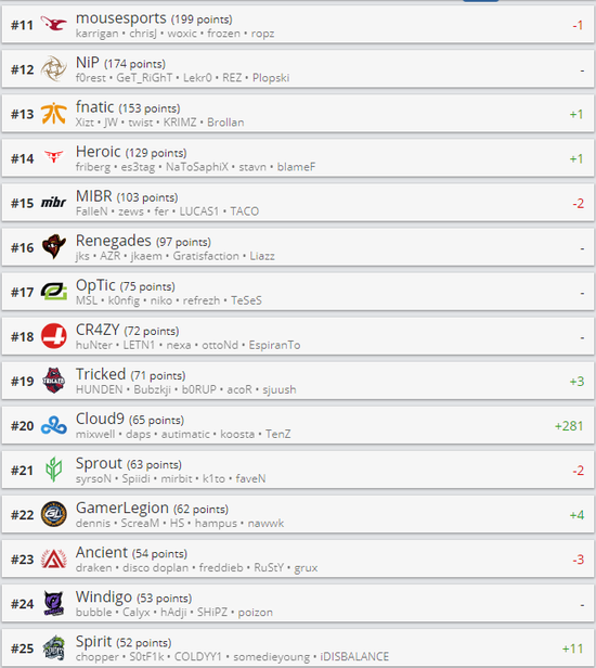 在这份榜单中进步最大的莫过于Cloud9,他们从之前的300名开外一下蹿升到了目前的20位,前进幅度高达281名,这在HLTV历史上也是进步幅度最大的一次。但是细看Cloud9过去一周的战绩,他们仅仅通过直邀参加了BLAST洛杉矶的比赛,并且在所有7张地图的较量中仅仅取得了一张地图的胜利,为何就可以有TOP20的实力?是名气还是过往?