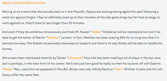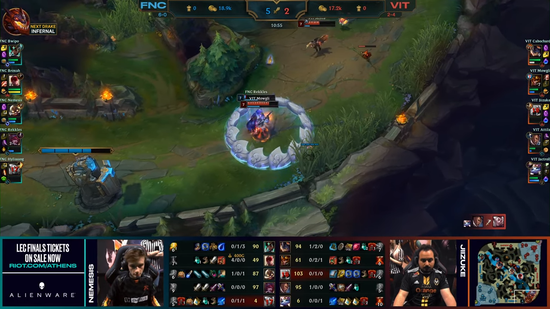 在之后的比赛中,FNC稳扎稳打,拿龙推塔,最终将人头比定格在16:5。FNC并没有想象中那么轻松的战胜对手,反而是VIT的很多失误给了FNC机会。而在面对Splyce的时候Fnatic显得更加的懈怠,先是将对手比喻成了“没有毒的蛇”并且表示了队伍各个位置上的优劣势,并且忽视了新英雄元素女皇奇亚娜的输出,最终输掉比赛。