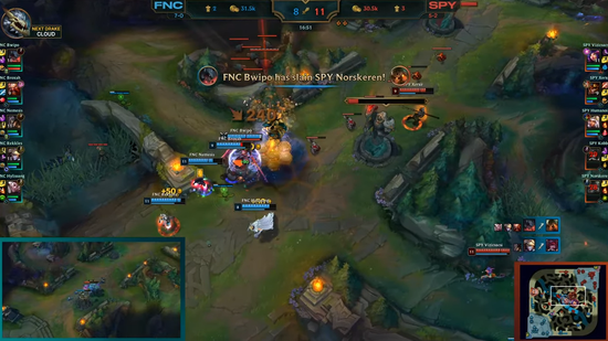 16分钟,SPY拿到峡谷先锋,顺势击破FNC中路一塔,FNC迅速包抄,再次击杀SPY两人,将人头比拉回8:11。