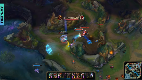 9分30秒,FNC库奇拿到蓝BUFF后想要配合辅助洛击杀VIT中路阿兹尔,但被阿兹尔大招推开顺利逃生,前来保护的嘉文四世见到队友没有威胁选择在河道拐角处回城,反而被FNC库奇和洛击杀。