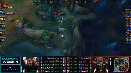 9分21秒,VIT在注意兰博阵亡后FNC中路库奇的走向后确认FNC正在拿蓝,嘉文四世配合卢锡安及悠米顺势拿下风龙。