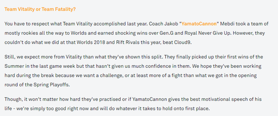 在7月13日-14日英雄联盟欧洲赛区LEC的赛场上,Fnaitc迎战了Team Vitality以及Splyce,最终以一胜一败结束了第一周的比赛,使Fnatic以7胜1负的战绩位列欧洲赛区第一,但是首周的1败并不是该有的结果,在7月11日Fnatic官网的一篇文章不难看出,Fnatic在面对第一周的对手有着明显的轻敌。