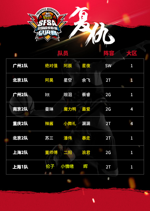 复仇队这边虽然有5支亚军战队,但是仅有一支非职业选手战队,LTT的战队,可见整体实力非常强大,拥有6支1区战队的复仇阵营势必将要复仇进行到底,经验丰富的他们能否完成复仇呢?