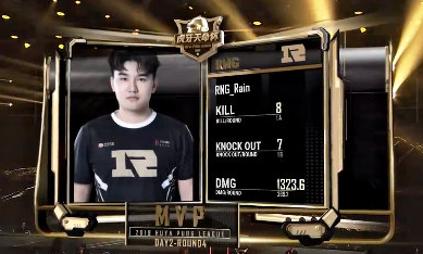 本局来到决赛圈的是JTeam满编、RNG三人、VC战队两人、Weibo一名独狼。“恐怖森林之王”RNG此时拿到了高达11个人头分。Weibo的独狼率先被VC率先淘汰出局,随后VC两人识图利用摩托车向圈内移动,然而双双殒命在了RNG的枪线之下。最后JTeam对战RNG四打三大战,RNG虽然人数更少,但是强悍的作战能力让他们更胜一筹,嘴周RNG成功吃鸡。