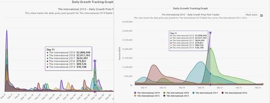往年都是坡起、爬升,而19年夏促当天简直就是原地起飞,由于夏日特惠公开贩售2份且价格同比贵了20%,当天奖金池就拉升了近200万美元,4天直接拉升了600万美元,光增长几乎就是Ti3的总奖金池的两倍。25%注入的奖金池增长600万,意味着夏促首周本子总销售达到2500万。