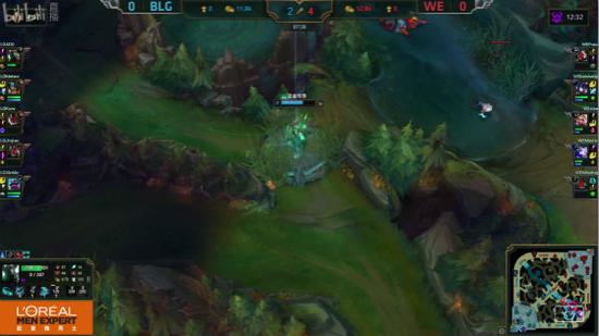 双方中野与下路分别进行一波换血后,WE众人集结想强行拿下小龙,然而BLG中下野血量更为健康,合围过来,抢下了小龙并打出一波2换4。