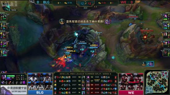 取得优势后,WE的下路开始发力,寒冰与塔姆在线上给到了韦鲁斯布隆极大的对线压力,为了帮助下路解压,BLG全员推进下路,想要利用峡谷先锋扳回局面,但凯南TP绕后加上BLG撤退的不果断,让WE再次连斩两人,巩固了前期的优势。