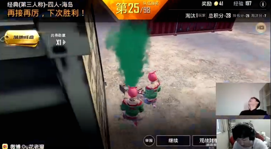 花老湿不愧是见过大场面的“一代宗师”,从选图到跳伞都插满了flag,感觉离成盒只差一个落地的距离。不仅富贵险中求带领两位路人一起奔赴G港,还在没有倍镜的情况下和敌人远处刚枪。果然,花老湿第一个倒下了。而赶来扶他的管煜正也被手雷命中,随着队友的相继淘汰,花老湿出师不利第一局就落地成盒了。