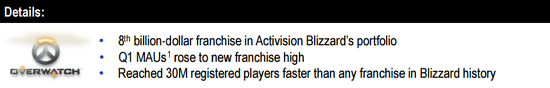 《守望先锋》是动视暴雪旗下第 6 款达到此成绩的游戏,此前的 5 款分别是《魔兽世界》《使命召唤》《命运》《糖果粉碎传奇》和《炉石传说》。