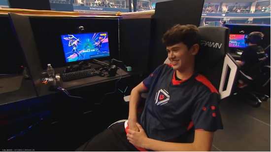 得益于稳健的心态,Bugha的发挥也是相当稳定。他能出其不意的出现在其他选手面前,终结敌人。第一场比赛中,只剩Bugha和Kreo选手二人。Kreo选手占据高点向下扫射,严重威胁到了Bugha。Bugha利用震荡波手雷,直接从下方起高来到Kreo面前,二人展开激烈交火。随后Bugha迅速移动到风暴圈前方,搭好板子,堵在Kreo必经之路上,在Kreo开板的瞬间,将其击杀。
