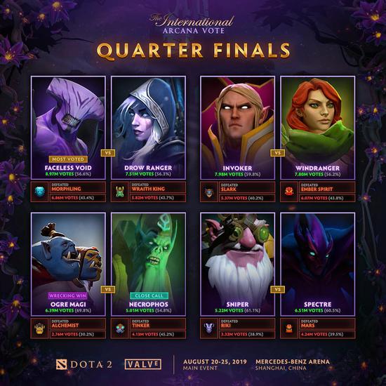 又经过了一周的PK之后,本次TI9票选至宝的八强已经全部出炉,分别是虚空假面、卓尔游侠、祈求者、风行者、食人魔魔法师、瘟疫法师、狙击手和幽鬼。