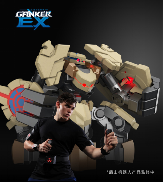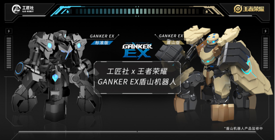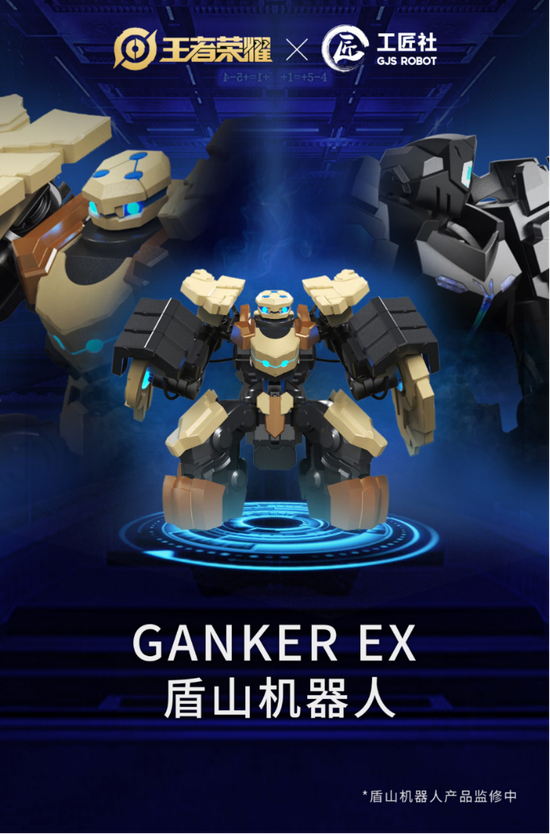 工匠社联合腾讯王者荣耀共同打造了一款基于“盾山”的英雄角色的消费级竞技机器人——GANKER EX盾山机器人,除外形极具表现力外,其还使用了人类肢体语言进行运动控制,真正实现了 “人机一体,姿态同步”。同时,骨架外壳分离设计,也可以让玩家在竞技的同时能体验到改装的乐趣,亦有寓教于乐的用途。工匠社运用最先进的“人机一体”技术,将虚拟场景中的全民IP英雄带到现实中的玩家面前,真实还原了王者峡谷场景下的经典对战,使玩家能够在现实中操控属于自己的“王者荣耀英雄”。这款与工匠社联合推出的GANKER EX盾山机器人,是王者荣耀首次在高科技领域的跨界授权合作,不仅是“技术”与“艺术”的融合,也是“虚拟”与“现实”的结晶,开启了打通线上线下、提升身心智趣的全新电子竞技娱乐方式。