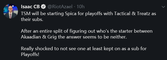 TSM将在季后赛阶段启用Spica作为首发打野,同时,Tactical和Treatz将作为TSM的替补选手。