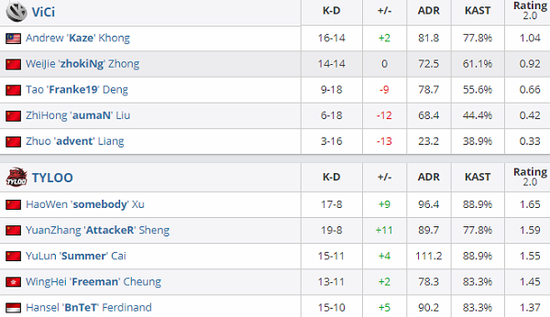 图三Overpass先做进攻方的TYLOO进攻极为犀利,TYLOO很快便以4-0领先。第5局双方默认过后VG一颗反清闪直取长管的两人,但3v5的局面Somebody的瞬秒双杀帮助TYLOO在极限的4秒下包。但次局TYLOO的搜点不仔细让躲在B包点的259以0换三成功翻盘,而扎实的补枪术帮助TYLOO稳定进入包点,依靠个人能力拿下长枪局的VG在次局又被孙哥的首杀破点,经济累积出色的TYLOO在上半场以11-4领先。