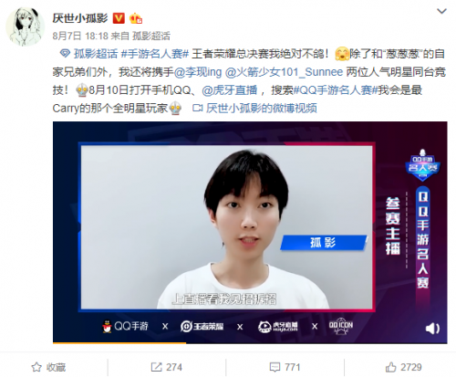 孤影在微博宣称会准时参加QQ手游名人赛的王者荣耀总决赛。除此之外,更让人惊喜的是他要和近日火到你一定在朋友圈见过的李现以及火箭少女101人气选手Sunnee同台竞技。