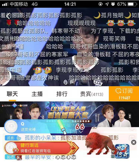 活动刚开始时,主持人大左依次请出李现和Sunnee两位明星,尽管现场多名人气主播同时在线,弹幕里依然被“李现”“孤影”的名字灌满。